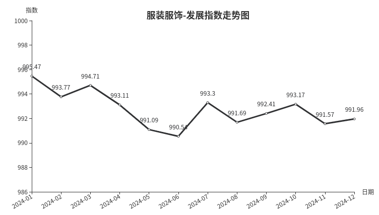 12月份,服装服饰类发展指数收于991.96点,环比上涨0.39点,涨幅0.04%;同比下跌3.18点,跌幅0.32%。