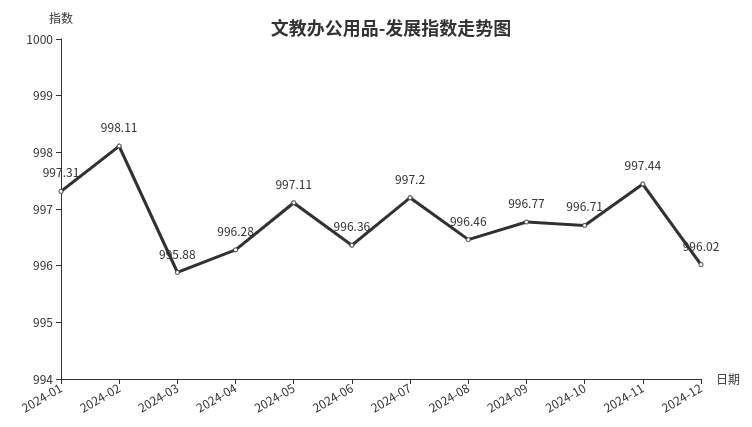 12月份,文教办公用品类发展指数收于996.02点,环比下跌1.42点,同比下跌1.26点。其中发展规模指数、发展效益指数、发展信心指数分别下跌0.82点、1.36点和2.72点。