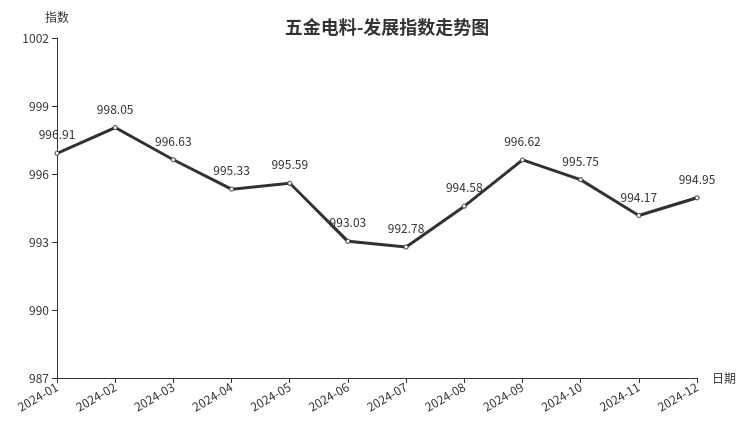 12月份,五金电料类发展指数收于994.95点,环比上涨0.77点,同比下跌1.30点。其中,发展规模指数环比下跌0.15点,发展效益指数、发展信心指数分别上涨0.66、2.84点。
