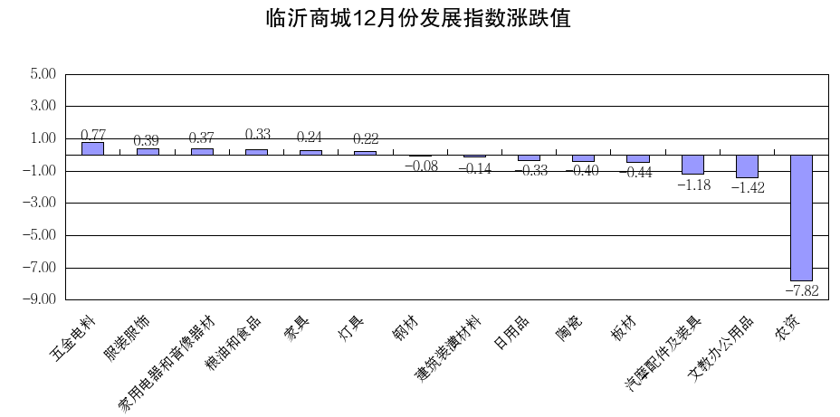 现将12月份发展指数涨跌幅较大和代表性较强的五金电料、服装服饰、文教办公用品、农资等市场行情作简要分析。