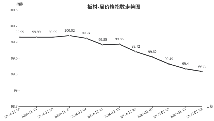 本周,板材类周价格指数收于99.35点,环比下跌0.05点,跌幅0.05%。从指数构成要素看,材料板材、周转板材周价格指数均下跌,分别下跌0.06点、0.02点,主要是密度板、木工板、铝塑板、石膏板、模板价格下跌。