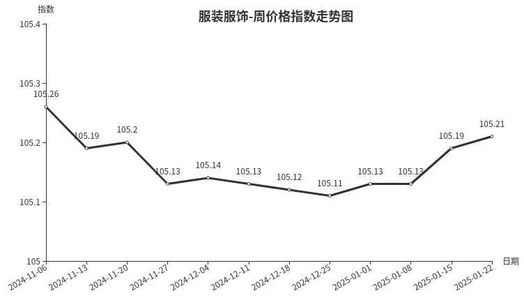本周,服装服饰类周价格指数收于105.21点,环比上涨0.02点。从二级分类看,服装类下跌0.02点,服饰类上涨0.03点,是拉动指数上涨的主要因素。