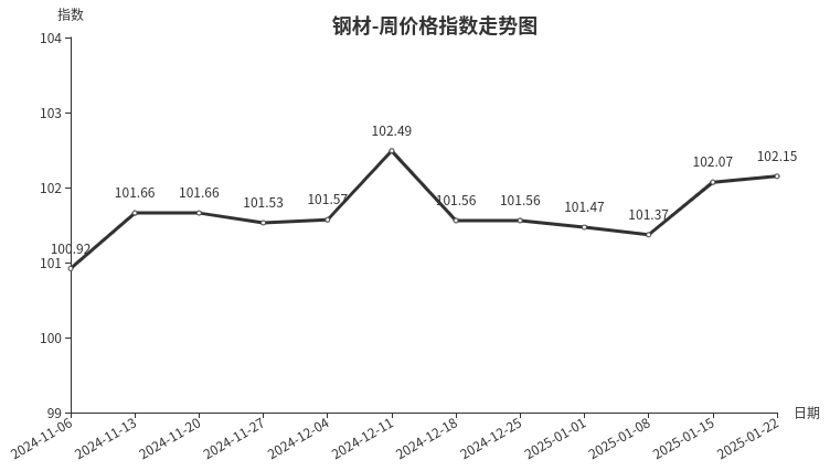 本周,钢材类周价格指数收于102.15点,环比上涨0.08点,涨幅0.08%。从盘面看,三级分类全部上涨,其中型材类、建筑钢材类、管材类、板材类分别上涨0.21点、0.10点、0.05点和0.02点。