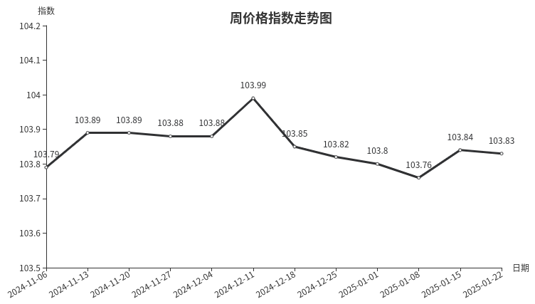本周板材类周价格指数继续走低。本周板材市场进入春节休市期,加之处于消费淡季,多类产品销量环比明显下降,销售价格延续近期走势,随行情继续下跌。从具体规格品看,1.22×2.44×0.15松木板本周均价为58.89元/张,价格环比下降1.85%;浩瀚牌1.22X2.44X0.017橡胶木实木板本周均价为208.23元/张,价格环比下降0.13%;0.018*1.22*2.44密度板本周均价为35.50元/张,价格环比下降1.39%。