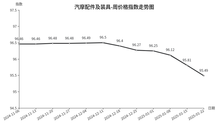 本周,汽摩配件及装具类周价格指数收于95.49点,环比下跌0.32点,跌幅0.33%。从盘面看,二级分类中有涨有跌,汽车配件价格持续走低,环比下跌0.49点;摩托车配件类指数环比上涨0.17点,主要是发动机部件价格上涨。