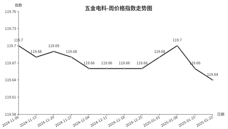本周,五金电料类周价格指数收于119.64点,环比下跌0.02点,跌幅0.02%。从指数构成要素看,建筑装饰五金类、五金工具类、电工电器类、仪器仪表类环比分别下跌0.04、0.03、0.03、0.03点;其他类价格较为稳定。