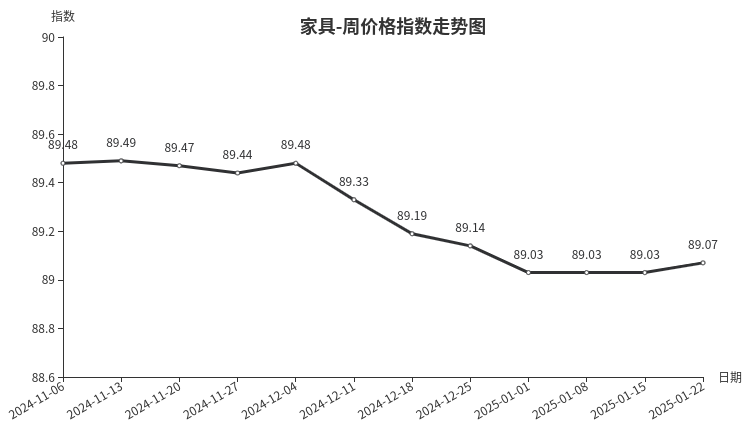 本周,家具类周价格指数收于89.07点,环比上涨0.04点。从盘面看,二级分类中床及用品类、坐具类价格均出现上涨,分别上涨0.13点、0.02点,是拉动周价格指数上涨的主要因素;柜类、桌类、架类指数均与上周持平。