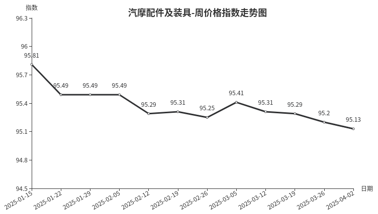 本周,汽摩配件及装具类周价格指数收于95.13点,环比下跌0.07点,跌幅0.07%。从指数构成看,二级分类中有涨有跌,汽车配件价格继续下行,环比下跌0.11点;摩托车配件类指数环比上涨0.09点,主要是电器和仪表部件价格上涨。