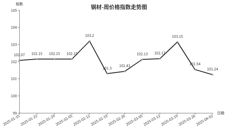 本周,钢材类周价格指数收于101.24点,环比下跌0.30点,跌幅0.30%。从盘面看,三级分类全部下跌,其中板材类、型材类、建筑钢材类、管材类分别下跌0.44点、0.42点、0.34点和0.22点。