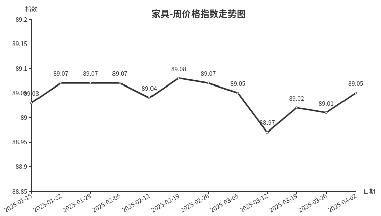 本周,家具类周价格指数收于89.05点,环比上涨0.04点。从盘面看,二级分类中坐具类、床及用品类、柜类分别上涨0.10、0.04、0.03点;桌类下跌0.04点;其他类与上周持平。