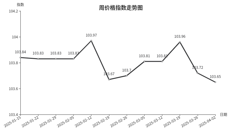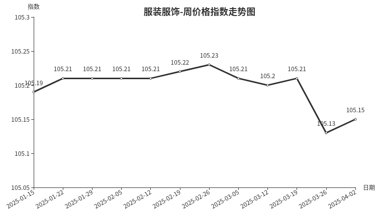 本周,服装服饰类周价格指数收于105.15点,环比上涨0.02点。从盘面看,服饰类价格指数上涨0.04点,是拉动周价格指数上涨的主要原因,服装类价格指数与上期持平。
