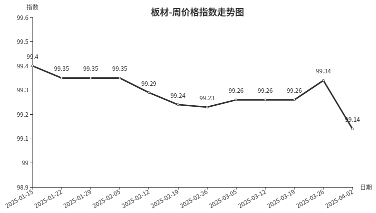 本周,板材类周价格指数收于99.14点,环比下跌0.20点,跌幅0.20%。从指数构成要素看,材料板材、周转板材周价格指数均小幅下跌,分别下跌0.23点、0.07点。