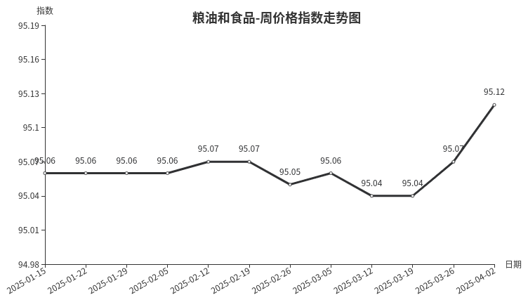 本周,粮油和食品类周价格指数收于95.12点,环比上涨0.05点。从盘面看,干果类、调味品类、粮油类价格指数均出现上涨,分别上涨0.22点、0.20点和0.04点;茶叶类下跌0.07点,副食类价格指数与上期持平。