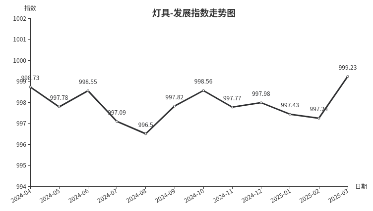 3月份,灯具类发展指数收于999.23点,环比上涨1.99点,同比上涨1.71点。其中,发展规模指数、发展效益指数环比分别上涨2.58、2.39点,发展信心指数与上月持平。
