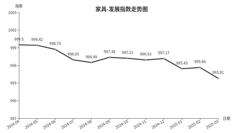 3月份,家具类发展指数收于993.81点,环比下跌1.85点,同比下跌5.11点。其中,发展规模指数、发展效益指数和发展信心指数均出现下跌,分别下跌1.68点、1.23点和3.45点。