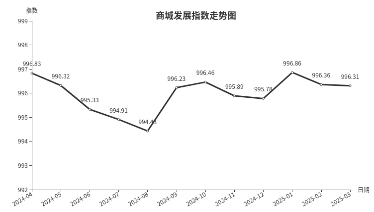 从发展指数构成来看,2025年3月份,发展规模指数收于996.77点,环比下跌0.10点,同比上涨0.35点;发展效益指数收于995.93点,环比下跌0.11点,同比上涨0.11点;发展信心指数收于996.18点,环比上涨0.17点,同比上涨0.10点。