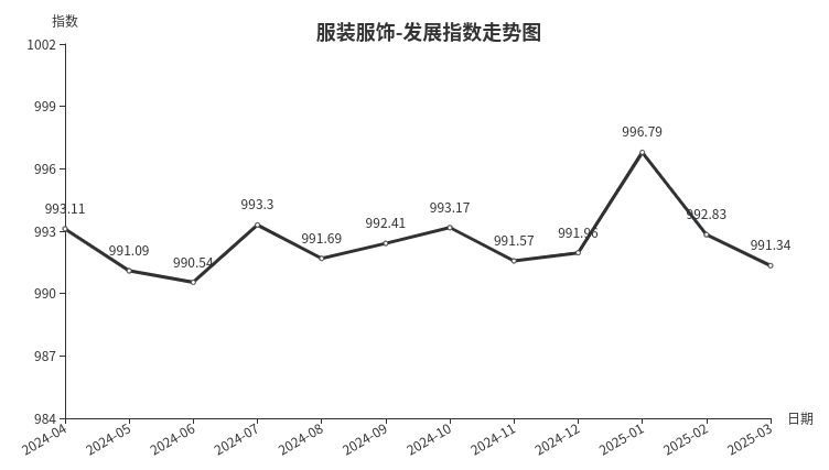 进入4月份,夏季服装上新,下游需求逐渐释放,预计服装服饰类发展指数将出现回升。