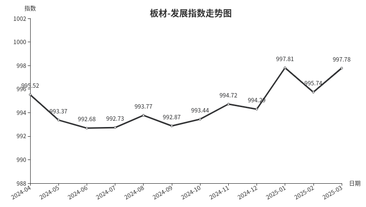 3月份,板材类发展指数收于997.78点,环比上涨2.04点,同比上涨3.42点。其中发展信心指数、发展规模指数、发展效益指数环比均出现上涨,分别上涨4.29点、2.13点、0.83点。