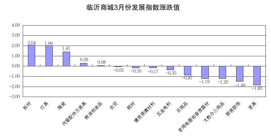 现将3月份发展指数涨跌幅较大和代表性较强的板材、灯具、服装服饰、家具等市场行情作简要分析。