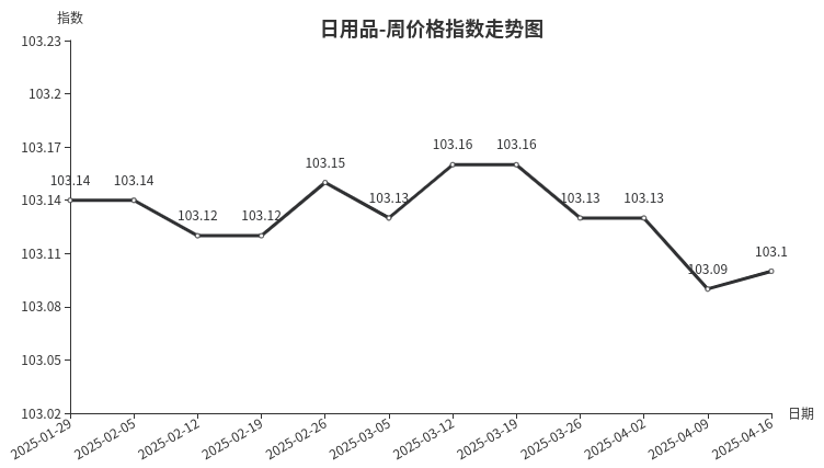 本周,日用品类周价格指数收于103.10点,环比上涨0.01点,从二级分类看,涨幅较大的有卫生清洁日用品类、针/纺织品类、玩具类、辅料和包装类,分别上涨0.10点、0.07点、0.02点和0.02点;护理及美容用品类、箱包类、劳动防护用品类、工艺品类分别下跌0.25点、0.18点、0.04点和0.01点;首饰类价格指数与上周持平。