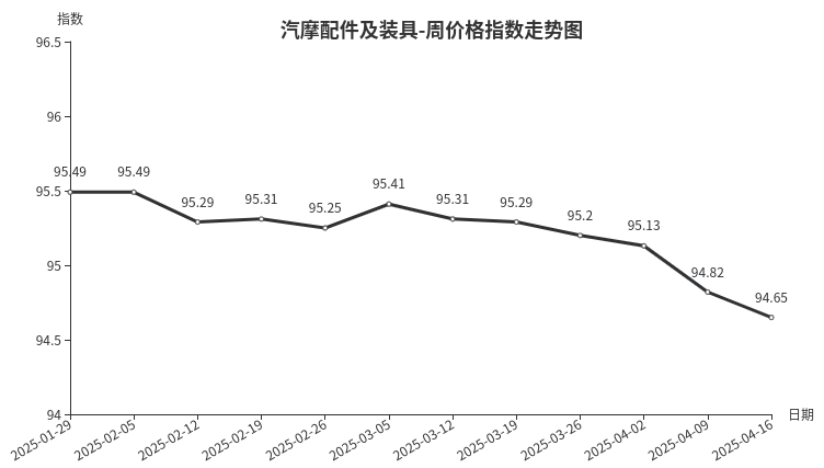 本周,汽摩配件及装具类周价格指数收于94.65点,环比下跌0.17点,跌幅0.17%。从指数构成看,二级分类中汽车配件类、摩托车配件类价格指数均下跌,分别下跌0.20、0.34点。