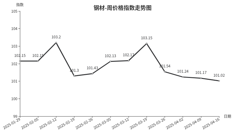 本周,钢材类周价格指数收于101.02点,环比下跌0.15点,跌幅0.15%。从盘面看,三级分类全部下跌,其中型材类、板材类、建筑钢材类、管材类分别下跌0.27点、0.24点、0.13点和0.08点。