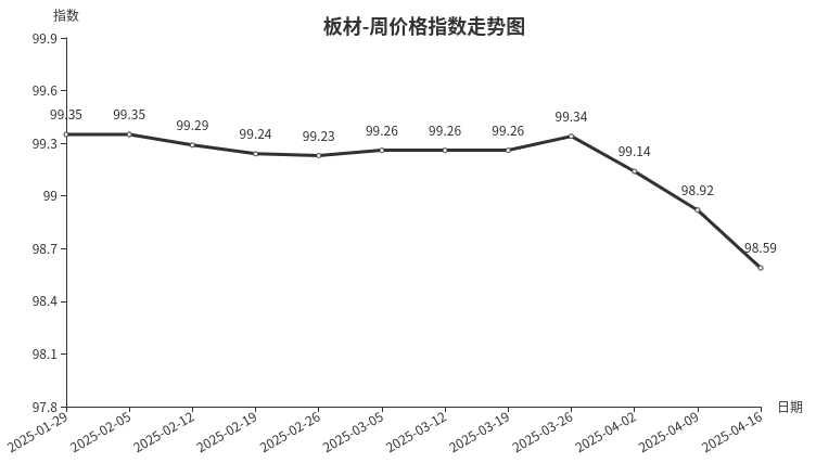 本周,板材类周价格指数收于98.59点,环比下跌0.33点,跌幅0.33%。从指数构成要素看,材料板材周价格指数环比下跌0.39点,成为拉动本周板材类周价格指数下行的主导因素;周转板材周价格指数环比下跌0.01点。