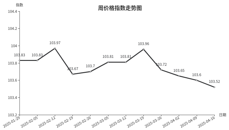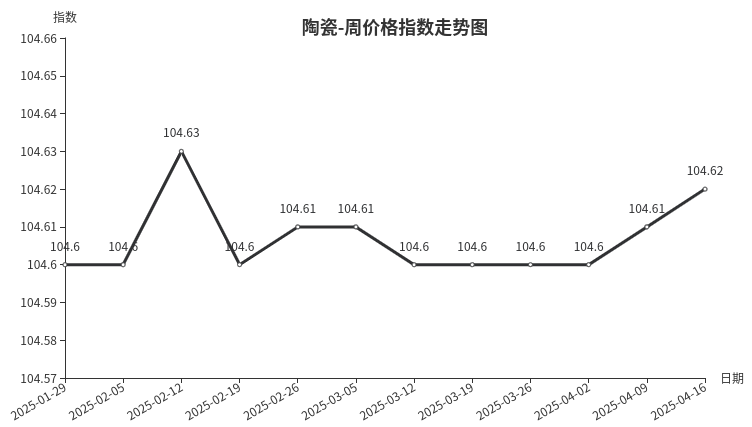 本周,陶瓷类周价格指数收于104.62点,环比上涨0.01点,涨幅0.01%。从指数构成要素看,日用陶瓷周价格指数环比小幅上涨,上涨0.10点,涨幅0.09%;陶瓷洁具、建筑陶瓷周价格指数环比持平。