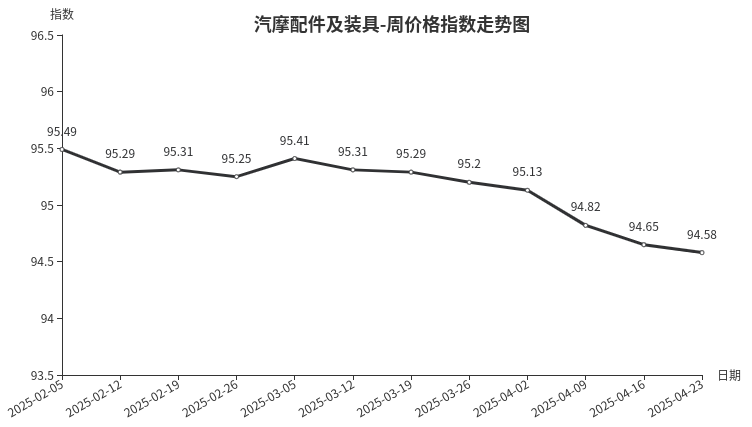 本周,汽摩配件及装具类周价格指数收于94.58点,环比下跌0.07点,跌幅0.07%。从指数构成看,二级分类中汽车配件类下跌0.14点;摩托车配件类上涨0.22点。