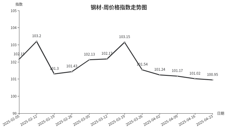 本周,钢材类周价格指数收于100.95点,环比下跌0.07点,跌幅0.07%。从盘面看,三级分类跌多涨少,其中板材类、管材类、型材类分别下跌0.11点、0.11点和0.04点;建筑钢材类上涨0.10点。