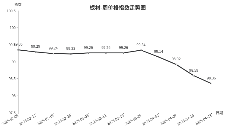 本周,板材类周价格指数收于98.36点,环比下跌0.23点,跌幅0.23%。从指数构成要素看,材料板材周价格指数环比下跌0.29点,成为拉动本周板材类周价格指数下行的主导因素;周转板材周价格指数环比上涨0.01点。