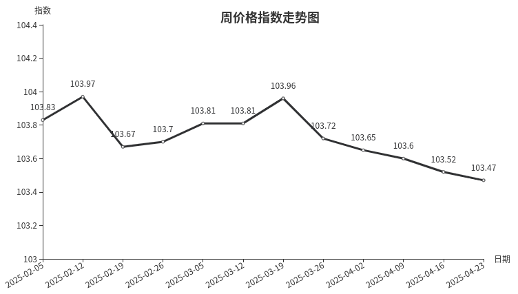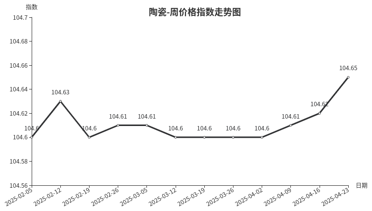本周,陶瓷类周价格指数收于104.65点,环比上涨0.03点,涨幅0.03%。从指数构成要素看,日用陶瓷周价格指数环比小幅上涨,上涨0.17点,涨幅0.16%;陶瓷洁具、建筑陶瓷周价格指数环比持平。