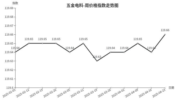 本周,五金电料类周价格指数收于119.66点,环比上涨0.02点,涨幅0.02%。从指数构成要素看,电线电缆类、电工电器类、建筑装饰五金类、五金工具类环比分别上涨0.12、0.01、0.01、0.01点;仪器仪表类、焊机/焊具/焊材类、五金零部件类价格指数与上期持平。