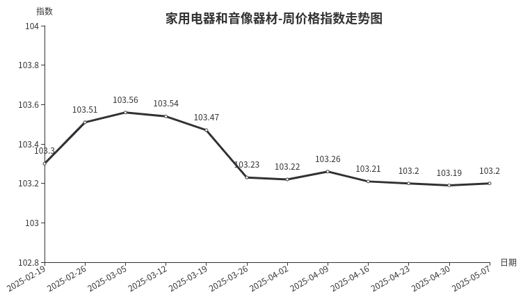 本周,家用电器和音像器材类周价格指数收于103.20点,环比上涨0.01点,涨幅0.01%。从盘面看,二级分类互有涨跌,其中制冷电器、热水器、厨房电器、个人生活电器类指数分别上涨0.10、0.09、0.03、0.02点;净化电器、音像器材类指数分别下跌0.14、0.02点。