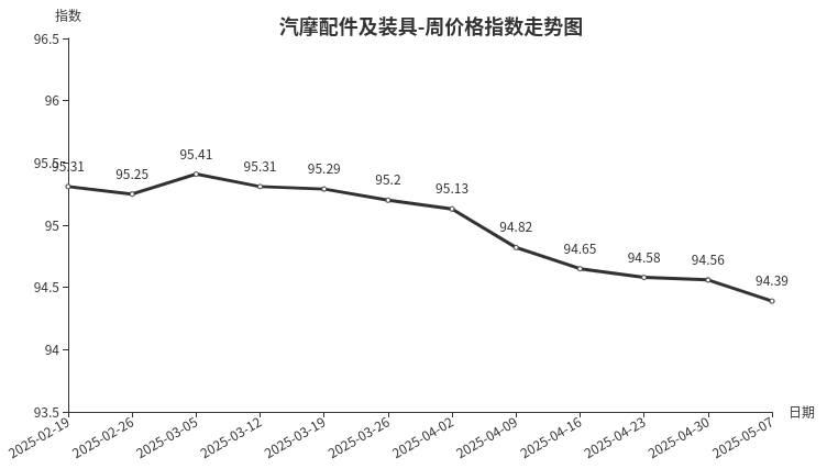 本周,汽摩配件及装具类周价格指数收于94.39点,环比下跌0.17点,跌幅0.17%。从指数构成看,二级分类中汽车配件类下跌0.26点;摩托车配件类上涨0.04点。