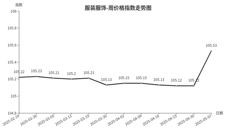 本周,服装服饰类周价格指数收于105.53点,环比上涨0.41点。从盘面看,服饰类和服装类价格指数均出现上涨,分别上涨0.48点和0.26点,是拉动周价格指数上涨的主要原因。