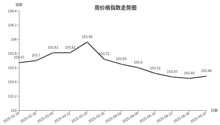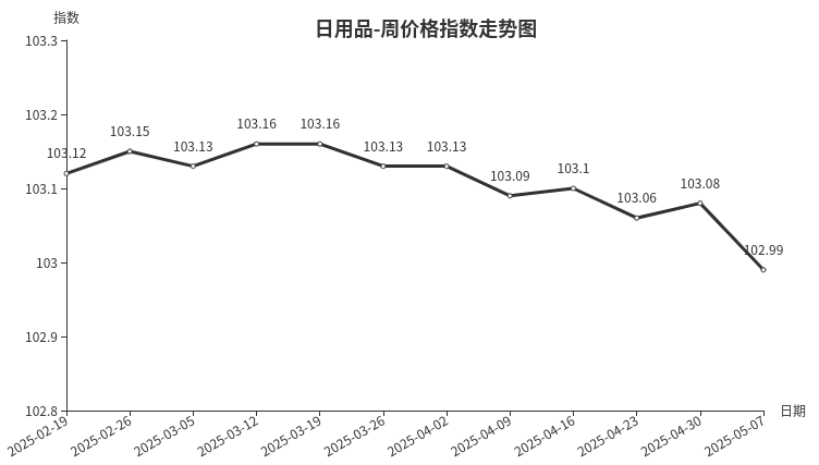 受五一假期带动影响,日用品市场需求释放,箱包、护肤美容用品、发饰品、日用工艺品等产品市场交易量环比上涨,市场客流量增加;为提高市场竞争力,部分产品销售价格小幅下调,中下游经销商积极备货,市场销售主要以集中采购为主,拉动平均销售价格小幅下降,致使本周日用品类周价格指数小幅下行。从具体规格品看,豹雪儿6612票夹本周均价为50.00元/个,价格环比下降3.85%;树脂萌果子小夜灯本周均价为11.69元/个,价格环比下降3.39%;摩登女孩弹力发绳本周均价为4.93元/个,价格环比下降3.33%。