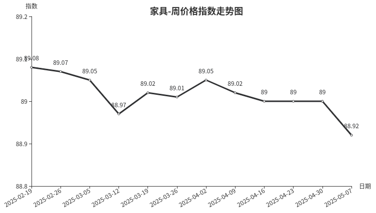 本周,家具类周价格指数收于88.92点,环比下跌0.08点,跌幅0.09%。从盘面看,桌类、柜类、坐具类、床及用品类指数均出现下跌,分别下跌0.16点、0.08点、0.06点、0.06点,拉动整体指数下行。