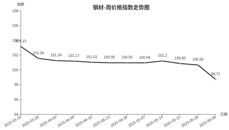 本周,钢材类周价格指数收于98.71,环比下跌1.95点。从盘面看,钢材类周价格指数跌幅增大,三级分类中型材类、建筑钢材类、板材类、管材类均下跌。随着农忙季节到来,钢材市场进入淡季,下游需求不足,市场发货量减少,价格下跌;同时上游原材料价格下降,共同拉动钢材价格下行。