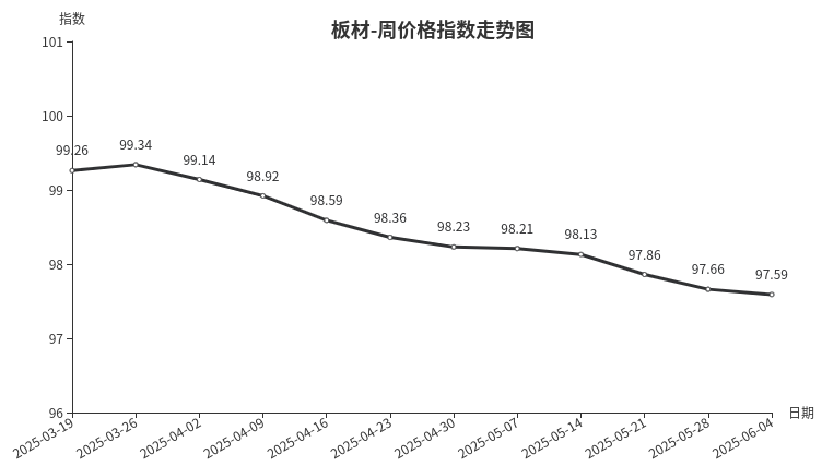 本周,板材类周价格指数继续小幅走低,收于97.59点,环比下跌0.07点。其中材料板材、周转板材价格均小幅下跌。受房地产行情持续低迷影响,当前板材市场需求减弱,库存占比增加,厂家为缓解经营压力、加快周转,小幅下调多层板、木工板、模板等部分产品出厂价格,经销商销售价格随之下调,带动本周板材类产品平均销售价格小幅下跌。