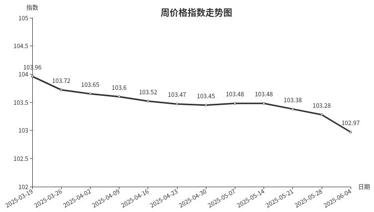 本周,服装服饰类周价格指数收于105.14点,环比上涨0.01点。从盘面看,服饰类价格上涨明显,服装类价格指数与上期持平。父亲节将近,服饰类中的腰带、助乐跑鞋销量乐观,价格同步上涨。服装类则涨跌互现,童装、内衣需求向好,价格略涨,男装因批发走量较多导致平均销售价格下跌。
