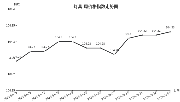 本周,灯具类周价格指数收于104.33点,环比上涨0.01点。从盘面看,家居照明、商业照明灯具价格回升;户外照明、灯具配件价格走低。目前家用吸顶灯、吊灯和商用灯盘、筒灯处于销售淡季,零售占比增加,带动价格上涨。相反,户外亮化装饰需求走强,成交量上涨,价格优惠让利。