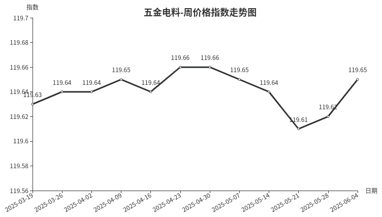 本周,五金电料类周价格指数收于119.65点,环比上涨0.03点。二级分类中五金工具类、仪器仪表类上涨。五金电料类周价格指数继续小幅上涨,其中电动工具受厂家调价影响,价格出现小幅上涨;手工工具、电工仪器行情偏淡,主要以零售为主,价格略有上行。