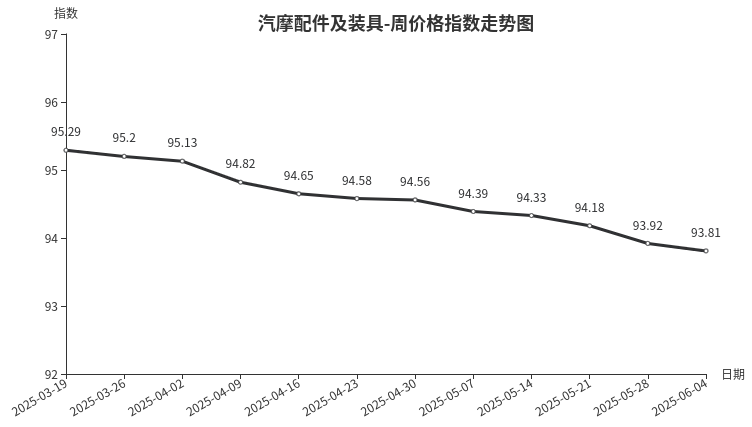 本周,汽摩配件及装具类周价格指数收于93.81点,环比下跌0.11点。汽车配件行情偏淡,需求处于低位,缺乏价格支撑,出厂价格连续下调。具体来看,发动机系统中的滤芯、活塞、四配套、底盘系统中的轴承、液压和电气设备中的蓄电池、发电机等价格继续下降。