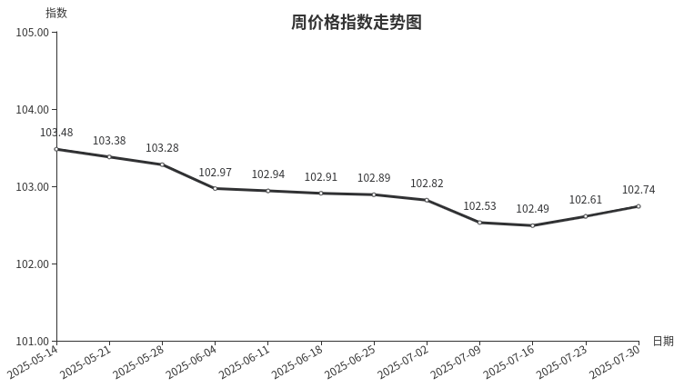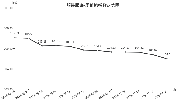 本周,服装服饰类周价格指数收于104.50点,环比下跌0.19点,服装类和服饰类均出现下跌。目前,市场经营户正积极筹备秋装上市,为加速清理夏装库存,加大促销力度。从品类看,男装、童装及鞋类降价幅度尤为显著,导致平均销售价格下跌。