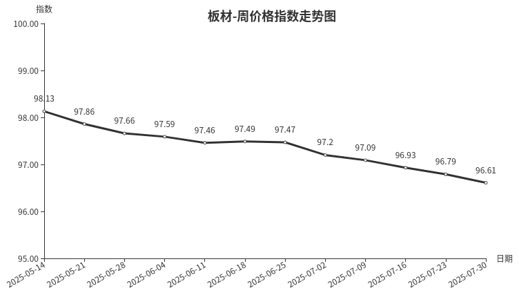 本周,板材类周价格指数收于96.61点,环比下跌0.18点,从盘面看,周转板材、材料板材周价格指数均小幅下跌。近期,板材市场整体行情较为清淡,终端需求减弱,橡胶、原木等原材料价格回落,厂家为缓解库存压力对模板、实木板、铝塑板等部分产品销售价格小幅下调,带动本周指数下行。