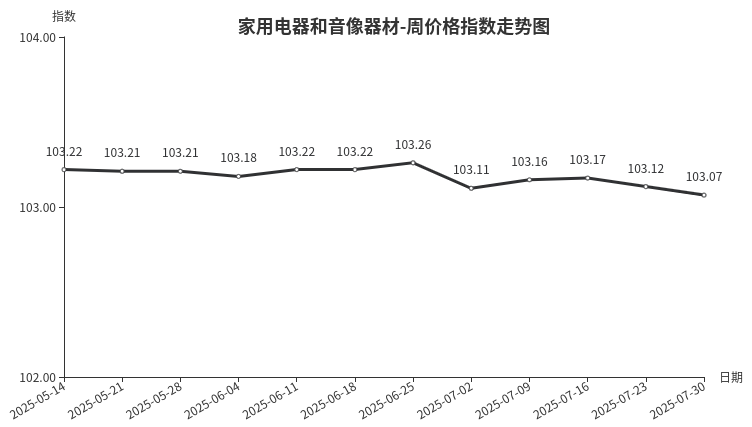 本周,家用电器和音像器材类周价格指数收于103.07点,环比下跌0.05点,从盘面看,制冷电器、净化电器、个人生活电器价格下跌。应季电器采购热情减退,空调、电风扇走货量继续下降,价格延续下跌走势;个人生活电器中电吹风、电动剃须刀销量下滑较为明显,部分高档规格商品价格调低。