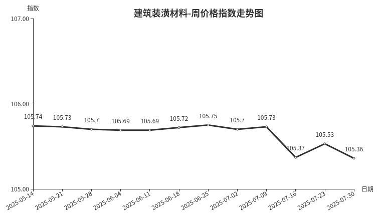 本周,建筑装潢材料类周价格指数收于105.36点,环比下跌0.17点,二级分类中装饰材料类跌幅明显。上游原材料价格下跌,市场铝型材销售价格小幅下降;地板革、玻璃胶等批发量增加,价格震荡下行。
