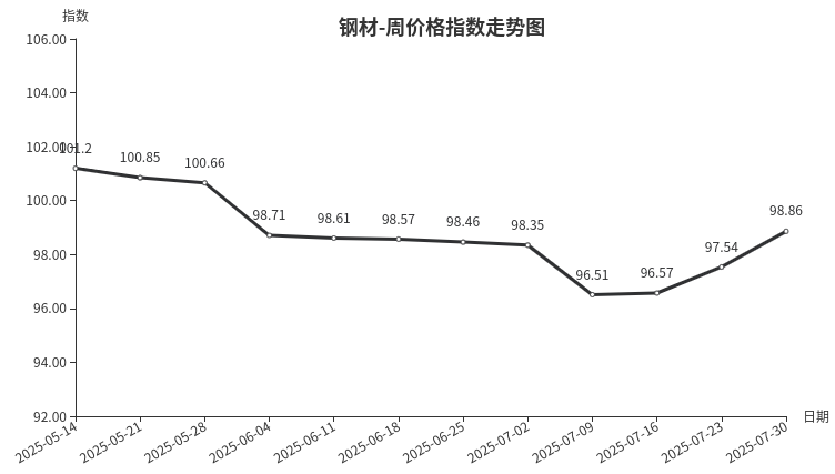 本周,钢材类周价格指数收于98.86点,环比上涨1.32点,分类中型材类、建筑钢材类、板材类、管材类全部上涨。本周,钢材类指数继续上涨且涨幅增大,“反内卷”政策持续发力,上游钢厂限产,期货市场、原材料价格上涨,现货市场价格跟涨,但下游需求有限,销量未见明显上涨。