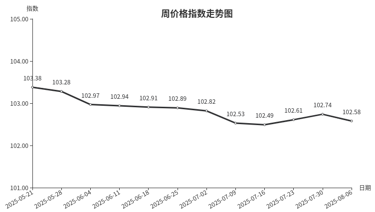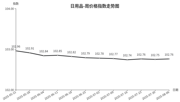 本周,日用品类周价格指数收于102.76点,环比上涨0.01点。从盘面看,箱包、针纺织品、首饰价格上涨,护理及美容用品、玩具价格下跌。当前正处于暑假期间,消费者外出游玩活动增加,背包、拉杆箱、家纺等产品需求释放,市场交易量增加,价格小幅上涨;受电商价格冲击影响,护理及美容用品部分产品价格小幅下调。